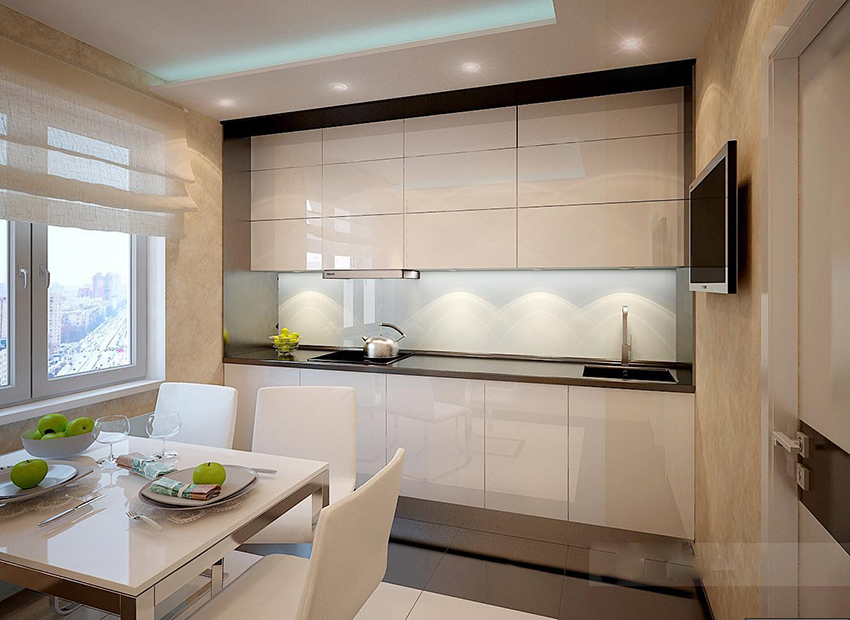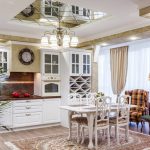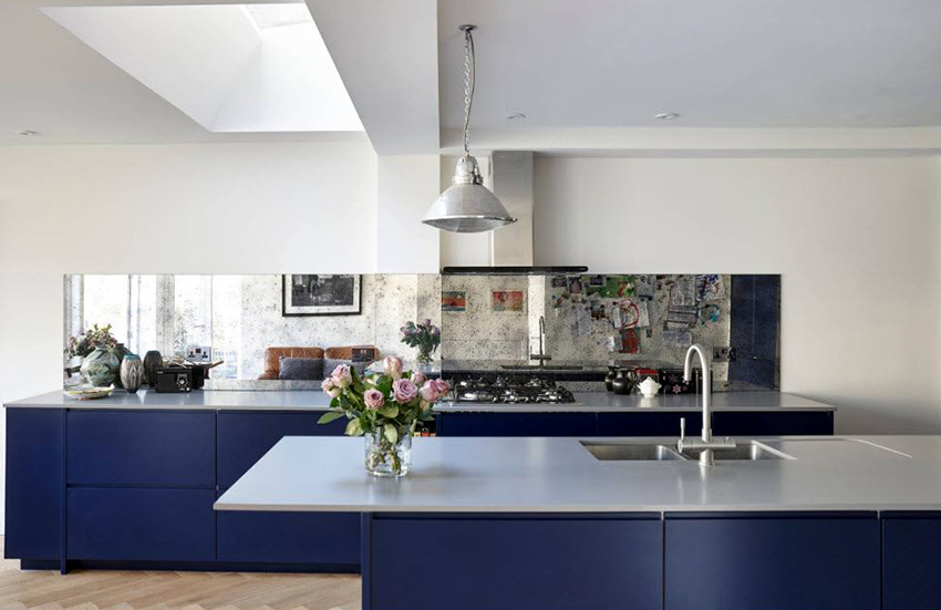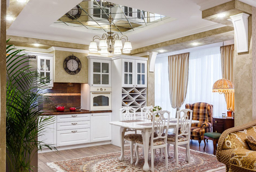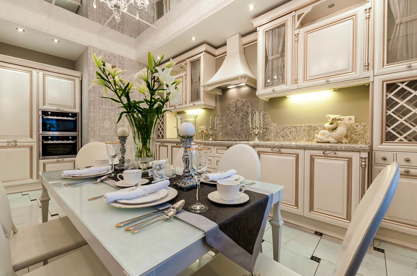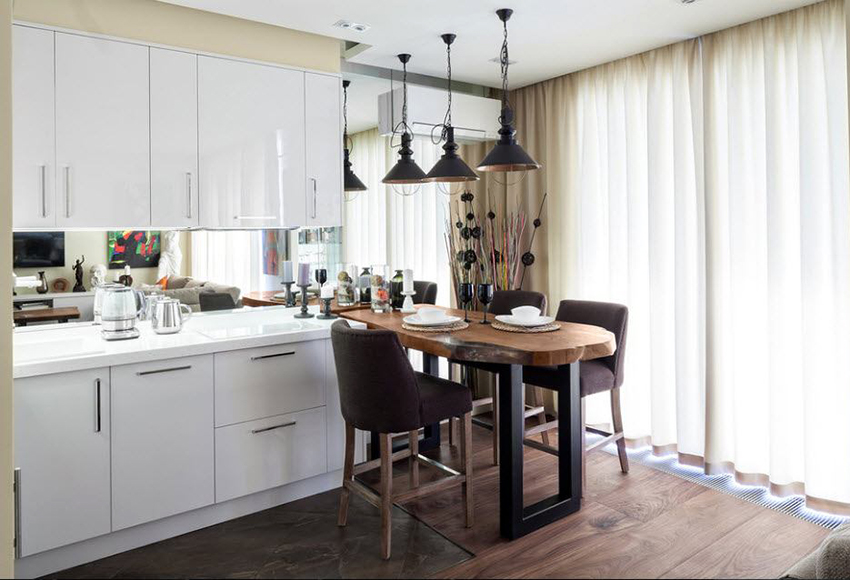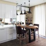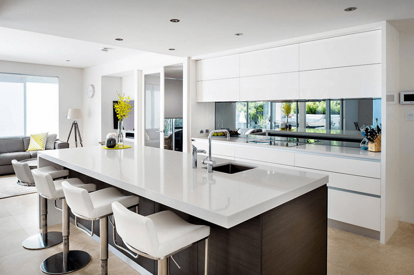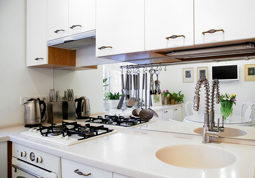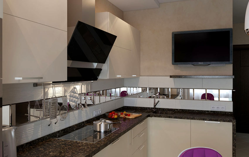 Before choosing a mirror as a decoration for a working area in a kitchen, there is one important nuance to consider. The reflective surface not only visually enlarges the space in the room, but also "doubles" the clutter and amount of dishes on the table. To avoid a feeling of clutter, it is advisable to maintain perfect cleanliness in such a kitchen, as well as to make the interior as “empty” as possible, that is, remove unnecessary items from the surfaces (hide dishes and small household appliances in a cabinet). In addition, it is not recommended to use roof rails.