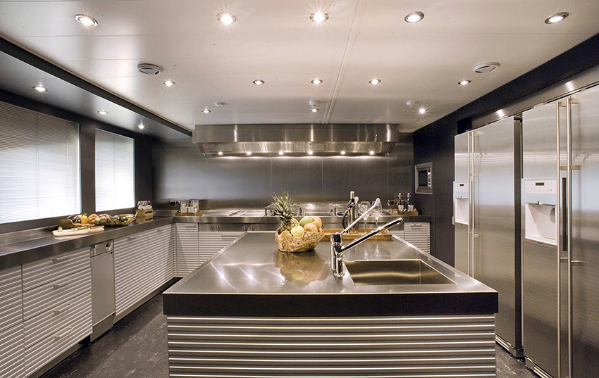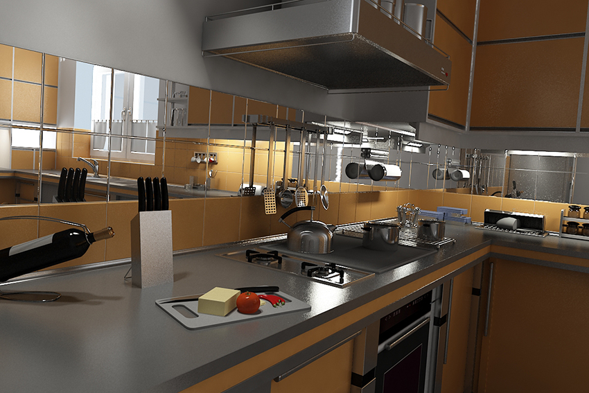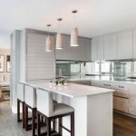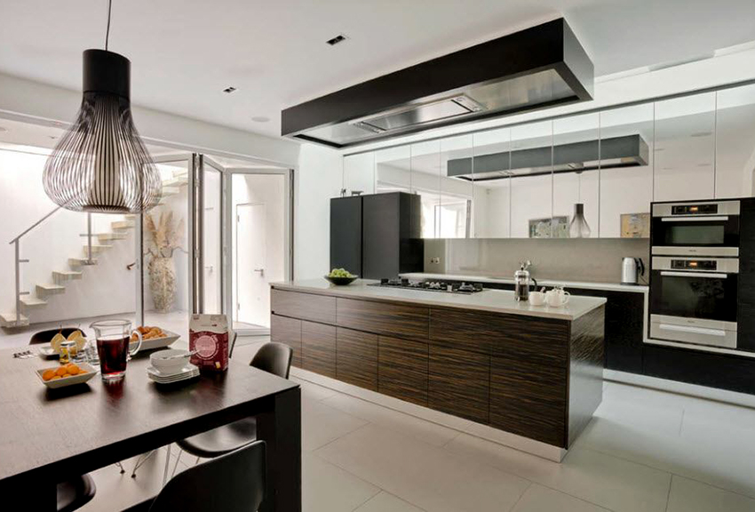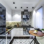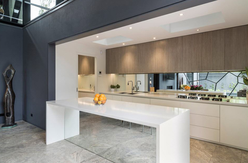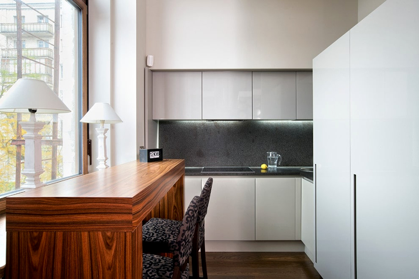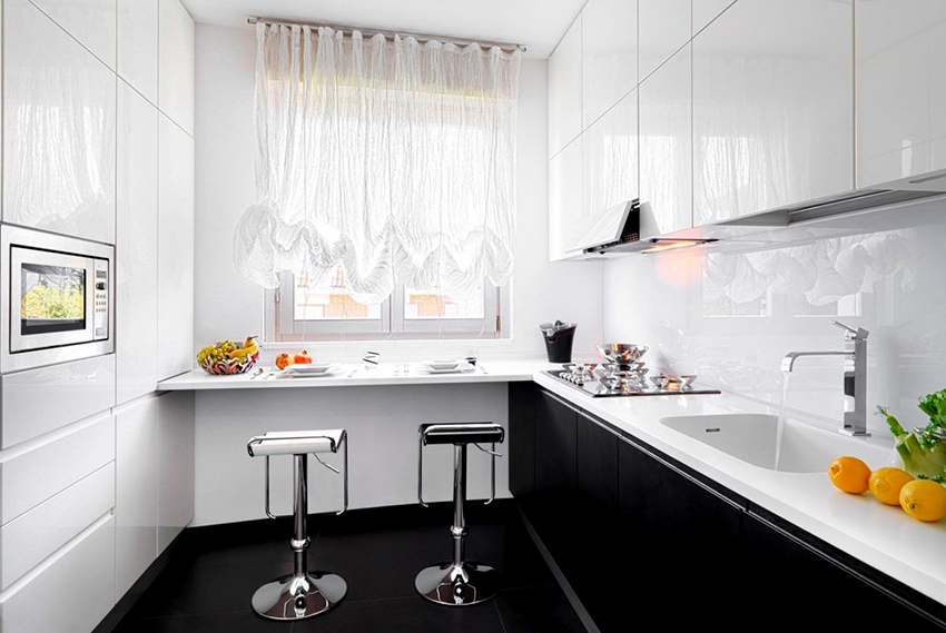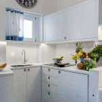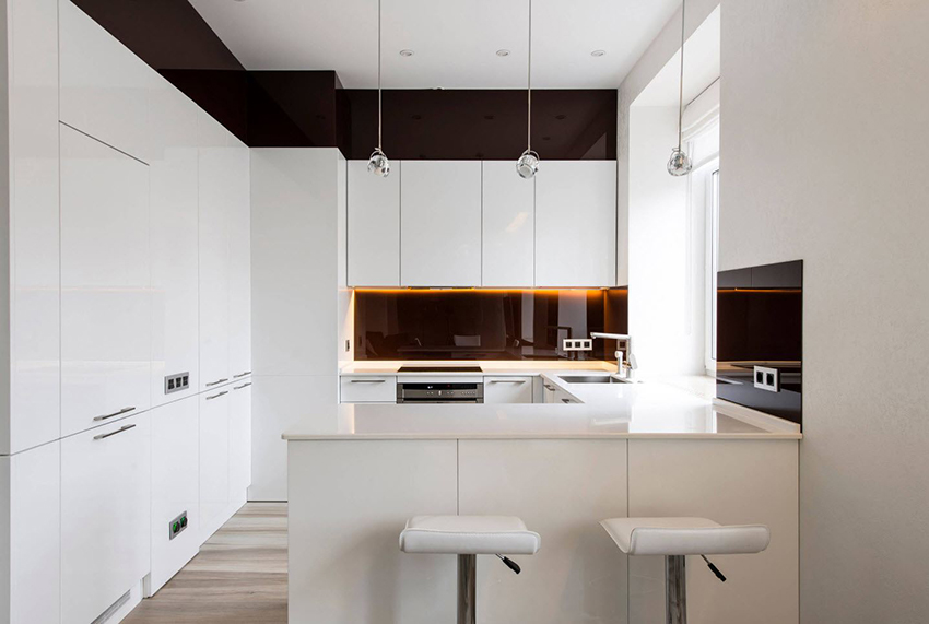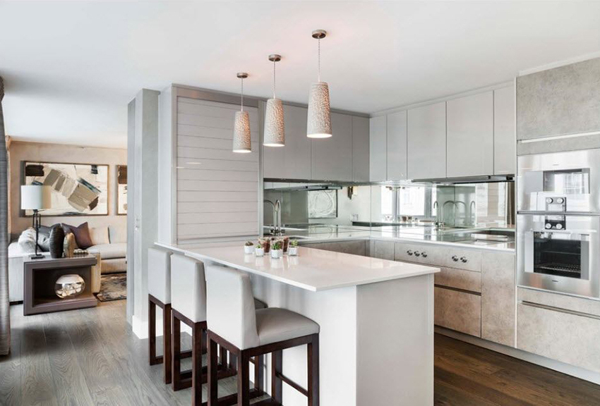 Before choosing a mirror as a decoration for a working area in a kitchen, there is one important nuance to consider. The reflective surface not only visually enlarges the space in the room, but also "doubles" the clutter and amount of dishes on the table. To avoid a feeling of clutter, it is advisable to maintain perfect cleanliness in such a kitchen, as well as to make the interior as “empty” as possible, that is, remove unnecessary items from the surfaces (hide dishes and small household appliances in a cabinet). In addition, it is not recommended to use roof rails.