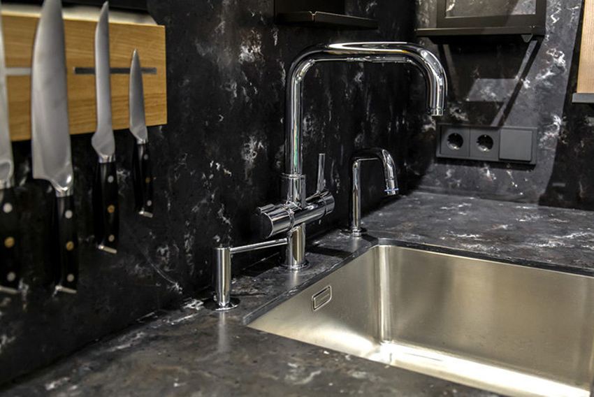 Useful advice! If you install a dark quartzite apron in the kitchen, thanks to the variegated surface, stains and traces of grease will not be visible on it.