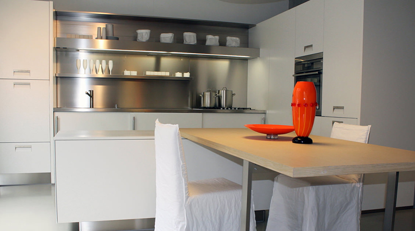 In addition, postforming is sensitive to aggressive cleaning, so its surface should not be abraded. To partially protect the apron from negative effects, sometimes chipboard is combined with resistant materials. Most often, metal inserts (stainless steel) or glass panels for the kitchen, which function as a screen, are used for this.