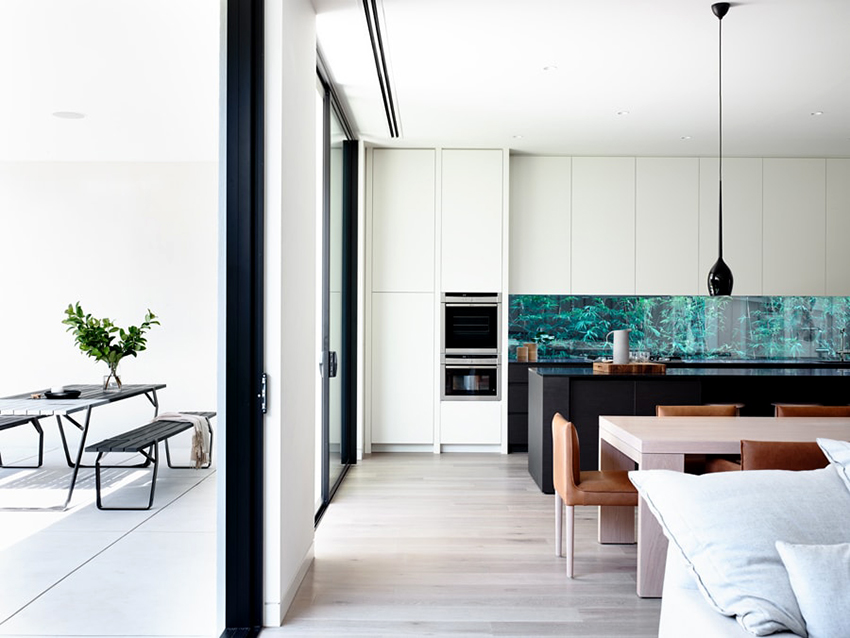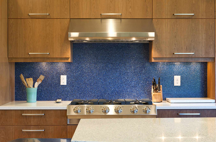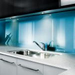 For the manufacture of aprons, not ordinary, but tempered glass is used. This material is safe and shock-resistant. Even if you try to break it, you cannot get hurt. When tempered glass breaks, it creates smooth pieces rather than sharp shards.Depending on the degree of transparency, there are two types of glass kitchen aprons: glossy and matte.