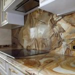 Onyx is a rather expensive stone, however, due to its decorative qualities, you can close your eyes to this drawback. This material is unpretentious to maintain. The onyx used to make aprons is carefully polished. This surface does not absorb moisture and grease drops. Natural onyx is not afraid of bleach, however, you should not use abrasive products for cleaning this material. Particles in their composition can scratch the surface.