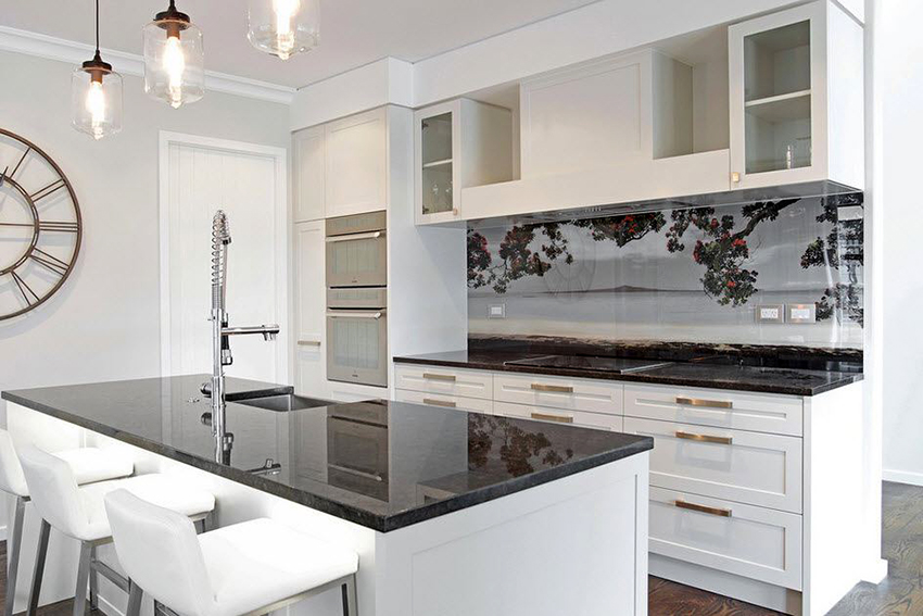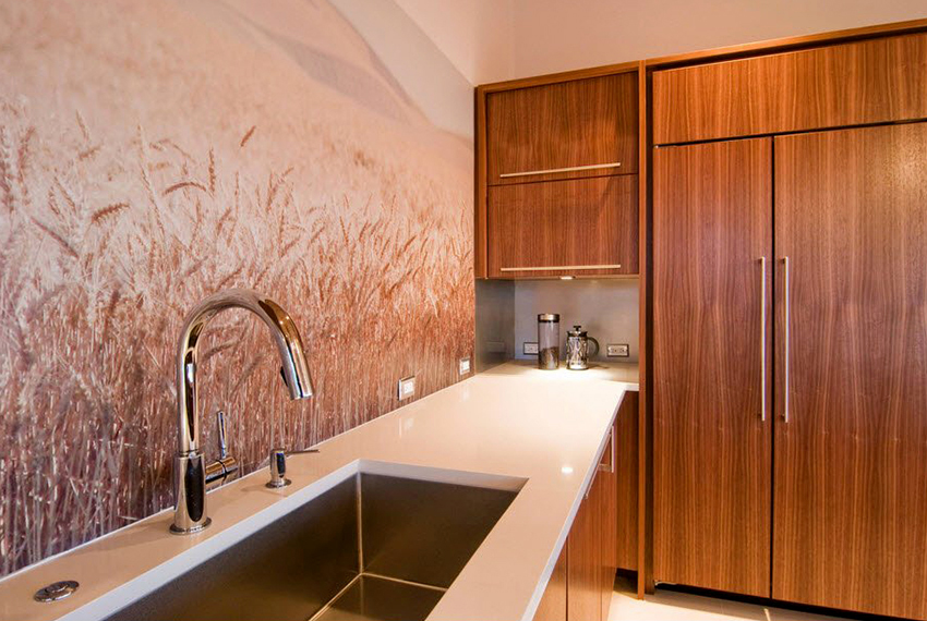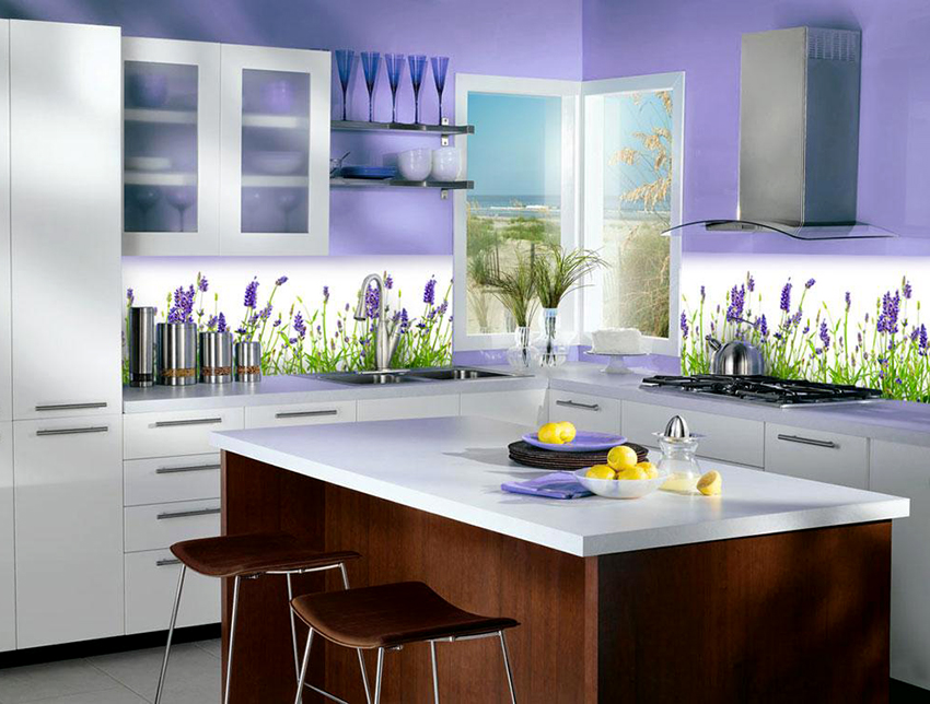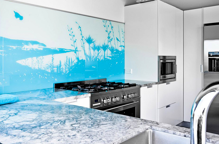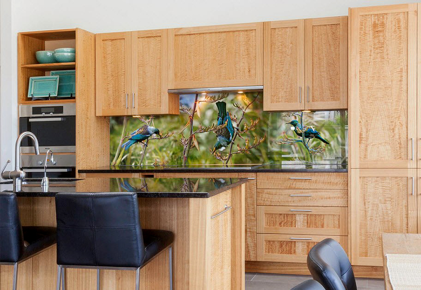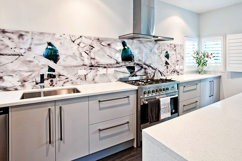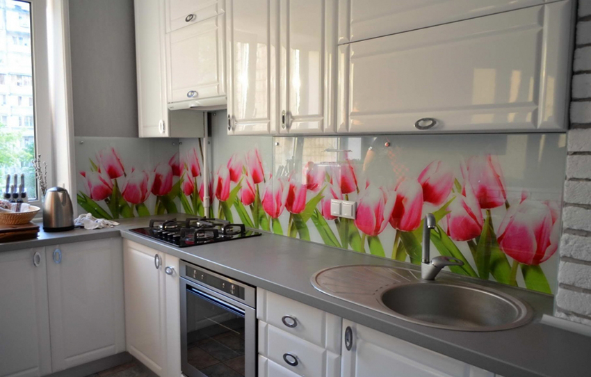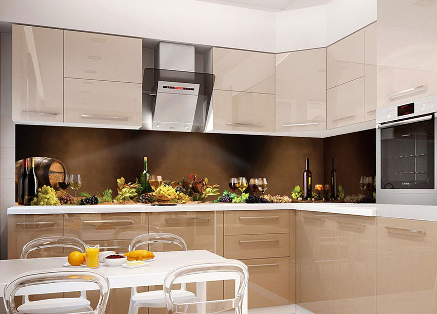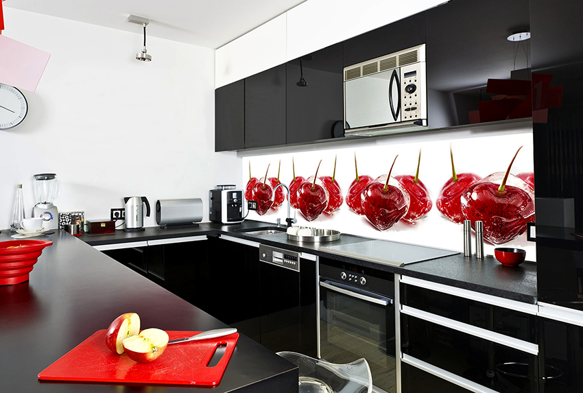 - Panels have endless possibilities for kitchen design. Photo printing on an apron allows you to transfer under glass any images and photos of the appropriate size and quality that the buyer likes.