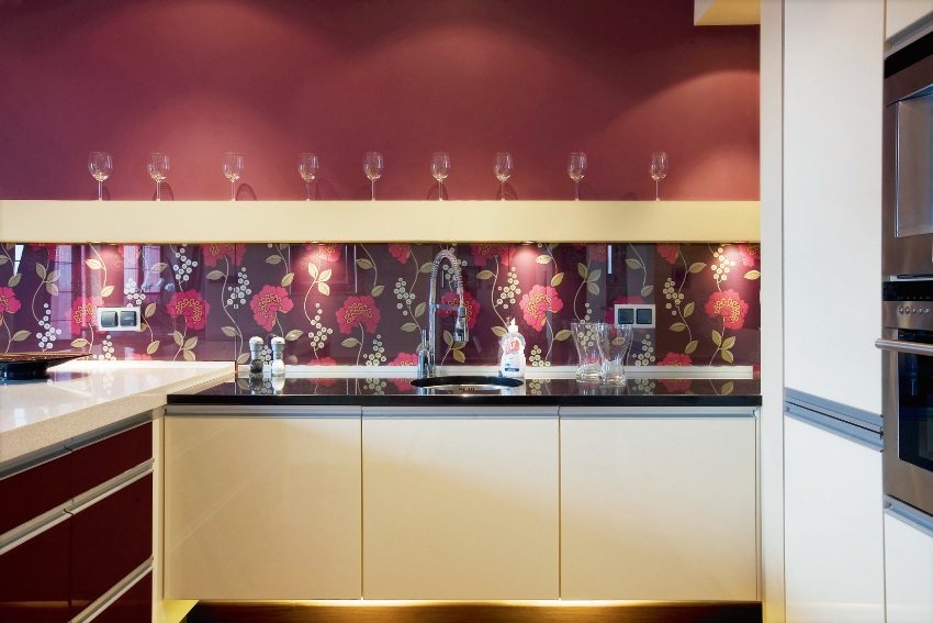 - optivayt - glass obtained as a result of the bleaching process. It does not have a characteristic bluish or greenish tint and therefore is perfect for creating aprons with a light and detailed pattern. The clarity of the glass allows even the smallest elements of the substrate to be reproduced in detail.But it is important to understand that you will have to pay for such characteristics, and the cost of the optical glass will be 1.5-2 times higher than the usual one. A photo of a kitchen with a cherry glass apron perfectly illustrates how bright and clear a drawing can be.