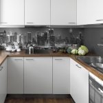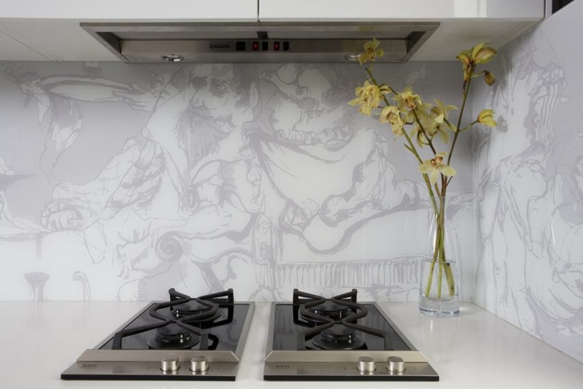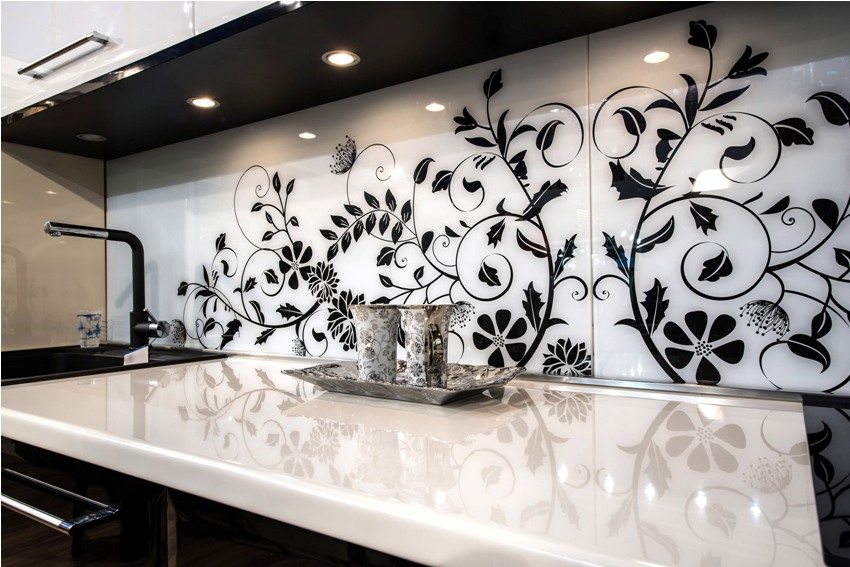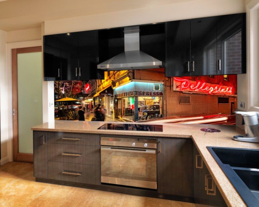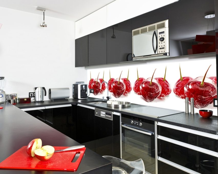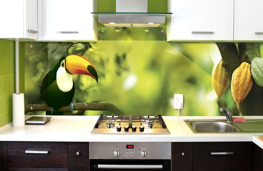 - the glass panel looks organic in any interior. It goes well with any matte and glossy surfaces, especially since you can independently choose skins for the kitchen in the photo catalog of images;