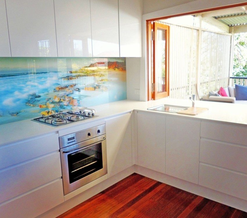- glass kitchen apron is a huge field for your imagination. Thanks to modern technologies, you can decorate it with photo and stereo printing, order a special substrate (both plain and with a print) or make a sandblast drawing on the surface. Photos of glass kitchen aprons perfectly demonstrate this;