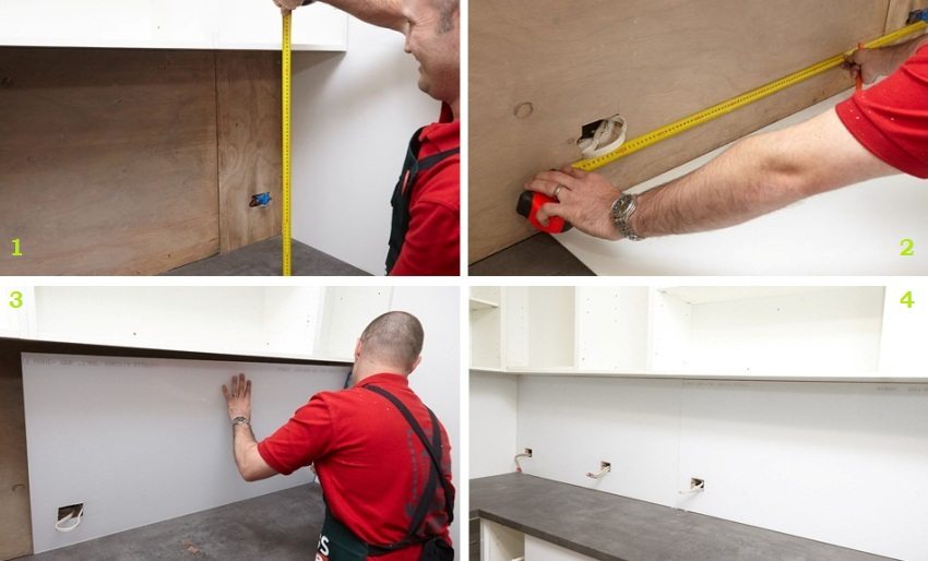 Instructions for correct measurement: 1 - the width of the apron along the bottom line of the hanging cabinets; 2 - the width of the apron along the upper line of the lower pedestals; 3 - the height of the apron at different points of the clearance between the furniture