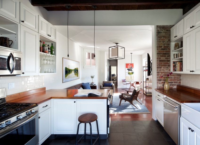 The disadvantage of this option is the inability to hide the kitchen equipment. The sink has to be pushed into the most remote corner. In an apartment with a kitchen combined with a living room (the photo can be seen in magazines), you should completely abandon the standard large-sized refrigerator.