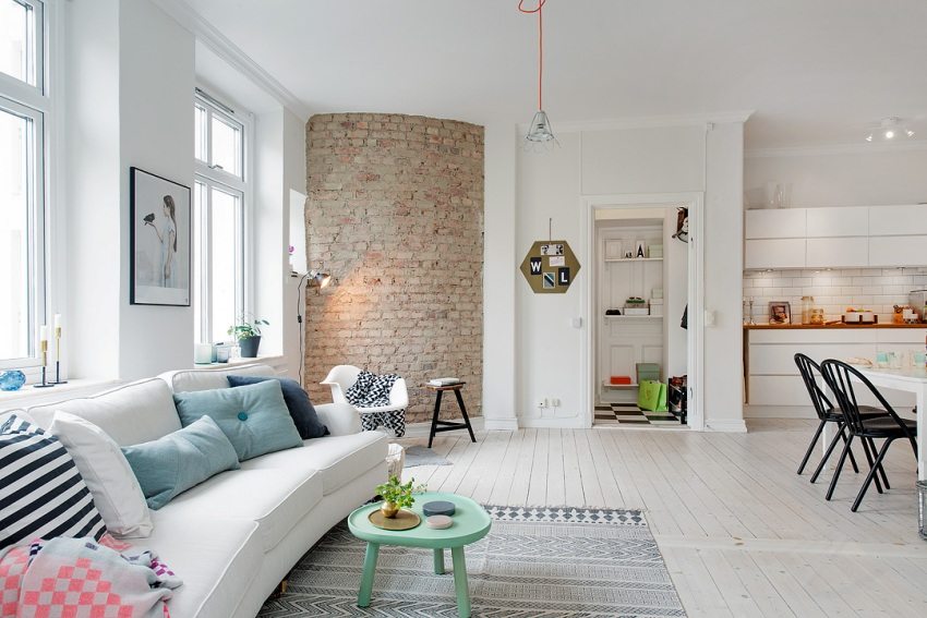 In the design of the living room, kitchen and dining room elements of the Scandinavian style