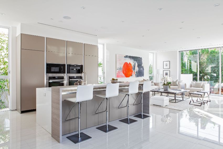 The kitchen combined with the living room is appropriate in an open-plan apartment. The living room combined with the kitchen in a private house also looks good. Photos in magazines often illustrate these two options. It is important here not to enlarge the room, but to properly dispose of the available space, to make the room more comfortable.
