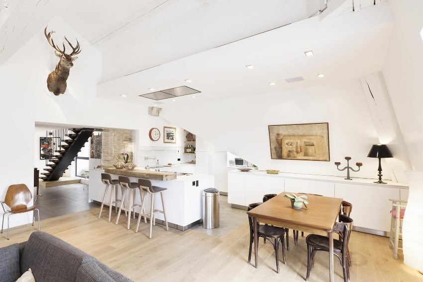 The kitchen island, adjacent to the wall, serves as a kind of border between the two functional areas