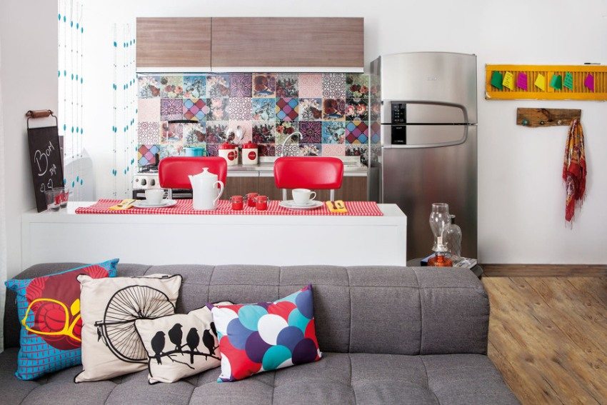 This zoning option is perfect for creating a beautiful design for a small living room combined with a kitchen (photos on specialized sites show this), placing the right accents with the help of bright shades. It is only important to remember simple rules: