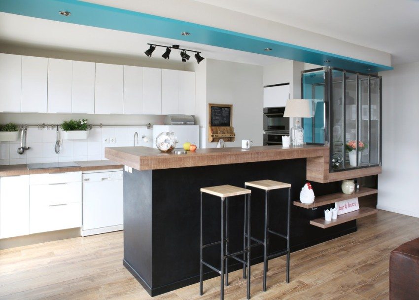 With a closed type of layout, the kitchen area is separated using bar counterpartially abandoned wall or furniture. Behind them, you can easily hide the sink, cutting surfaces from prying eyes - everything that will look out of place in the living room. You can place additional household appliances - a dishwasher or oven.
