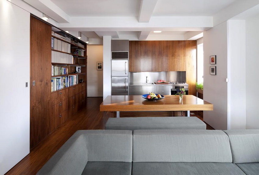 Modern options are quite acceptable in a small room, but subject to a visual expansion of the space. Currently, the design of premises is unthinkable without zoning, which is necessary in order to free up more space in the kitchen or in the room combined with the living room.