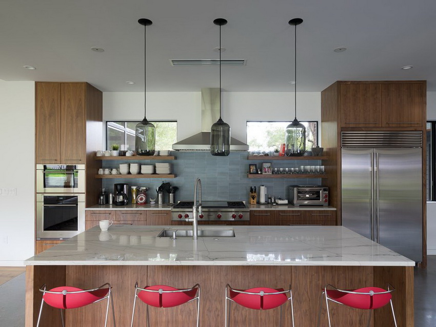 Unlike other styles, modernism has a place for various materials. Therefore, in furnishing rooms for cooking and eating, natural and synthetic materials are equally acceptable: