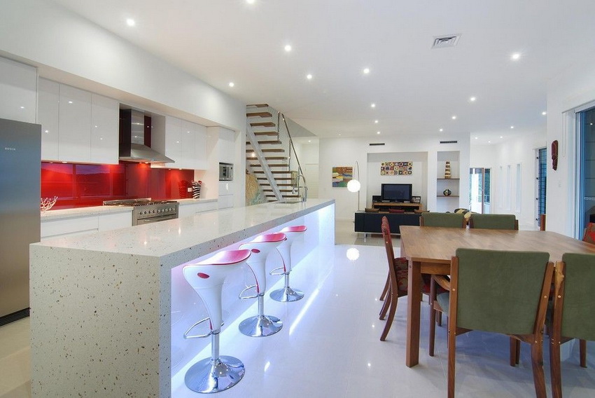 Kitchen interior in a "modern style" usually meets all the canons and norms of modern design. However, there is an unshakable rule: if furniture of an unusual shape is used, then it is better to choose a monochrome color scheme.