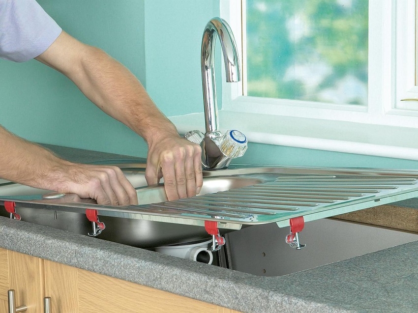Such a structure is inserted into an opening cut using a specific template. The complete set includes special mountings. After finishing the installation, you will need to seal the joint between the sink rim and the countertop in order to exclude moisture and damage to the furniture.