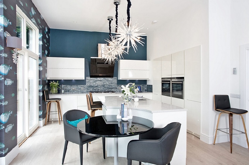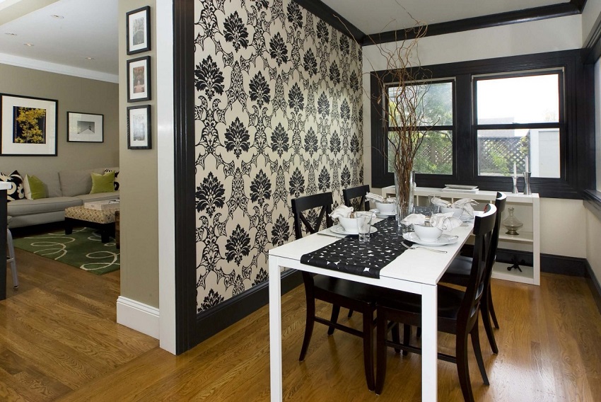 You can also play on contrasts using a monochrome color scheme. Before you start choosing a wallpaper design for a black and white kitchen, you should determine which of the shades will be the main one. The predominance of black color will add mystery and depth to the interior. Using white as the main shade will fill the room with air and light, and visually increase its size.