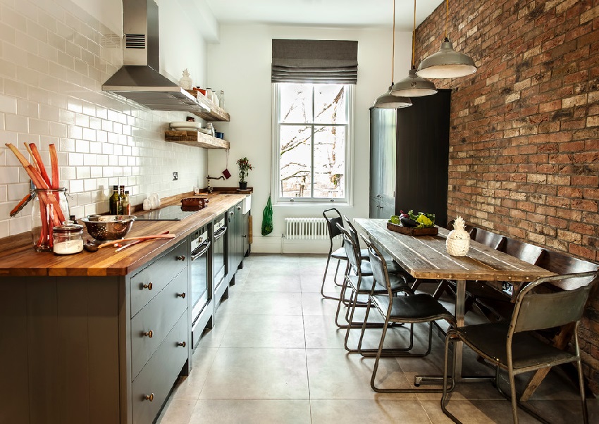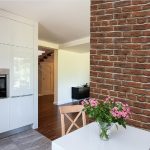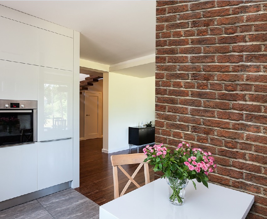 The best option would be to use brick wallpaper in the kitchen. Usually, the working area (apron) is made out with such material, although the use of canvases on other surfaces of the room is also allowed. Wallpaper imitating brickwork can be made not only with the use of 3D printing, there are also common versions of products on sale that convey the beauty of this material due to the embossed texture.