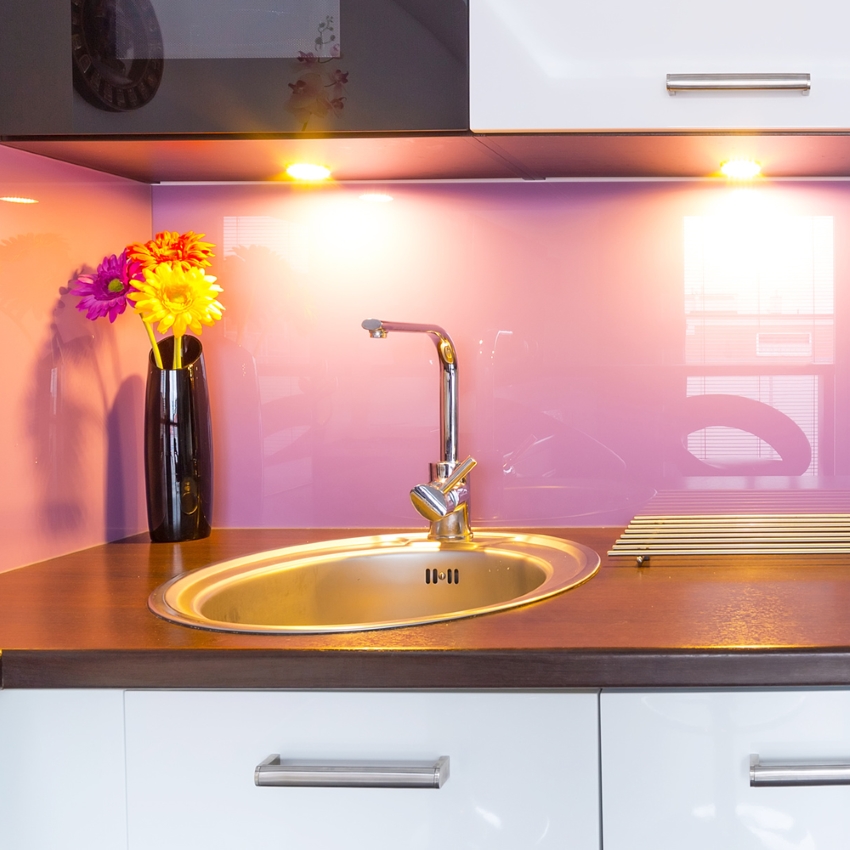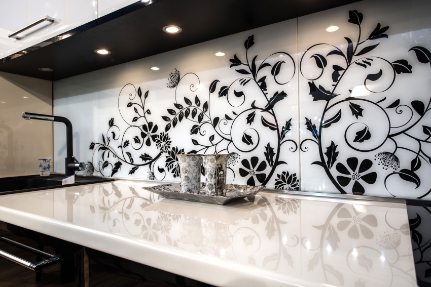 In order for the panel to have sufficient strength, heavy-duty tempered glass is used for manufacturing, the thickness of which is more than 4 mm. Thanks to a special processing technology, such panels are resistant to impacts, high temperatures and are not prone to deformation. In addition, any chemicals can be used to clean them. All these characteristics allow you to safely place glass panels in close proximity to the stove and work surface.