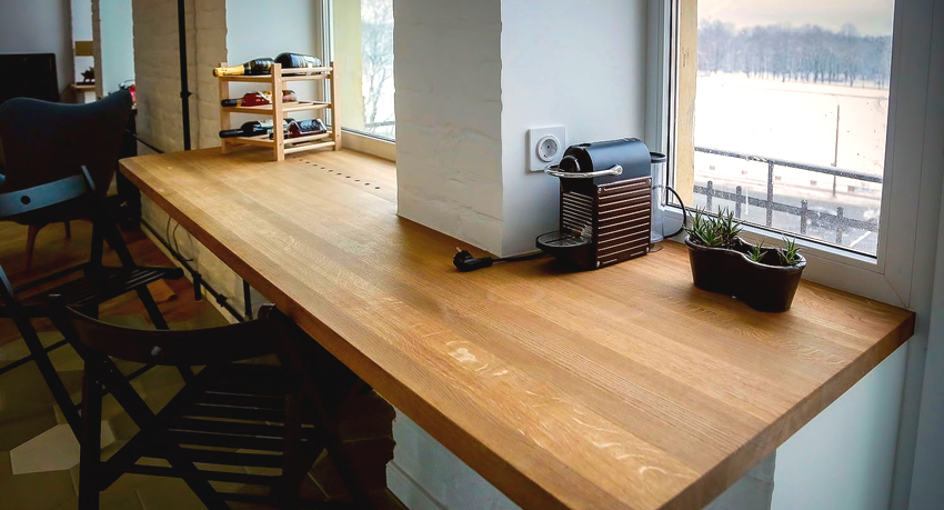 In each case, the dimensions of the bar counter are selected individually. First of all, at least one of the devices should be placed on it, that is, the width of the tabletop cannot be less than a third of a meter. Its edge will need to be moved forward at a distance sufficient so that those who sit behind the counter do not rest their feet on the wall under the window.