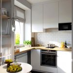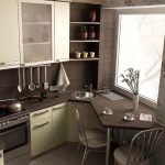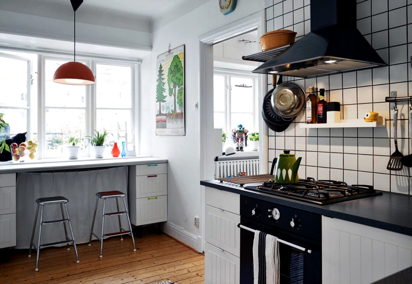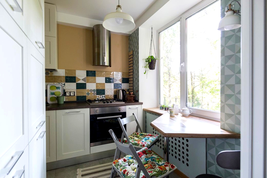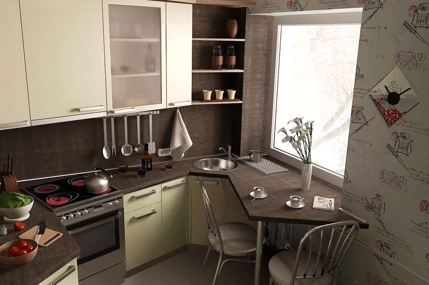 The simplest and most natural way out in the event that there is not enough space for organizing the working area is to create a table from the windowsill. The fact is that a rather wide window sill by itself may well act as a countertop or a horizontal auxiliary surface. And if you enlarge it a little and cover it with a layer of waterproof sanitary solution, you can get a functional work table in the kitchen.