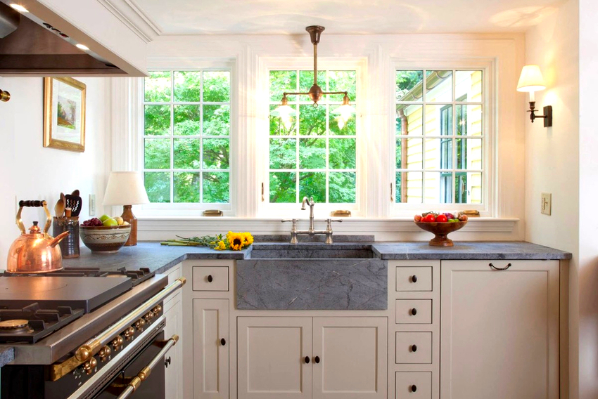 Note! In the event that the window slopes are not very wide, when organizing a sink in the countertop for the window sill, the window will often get splashed. In addition, the mixer will act as an obstacle to opening the window.