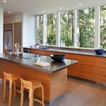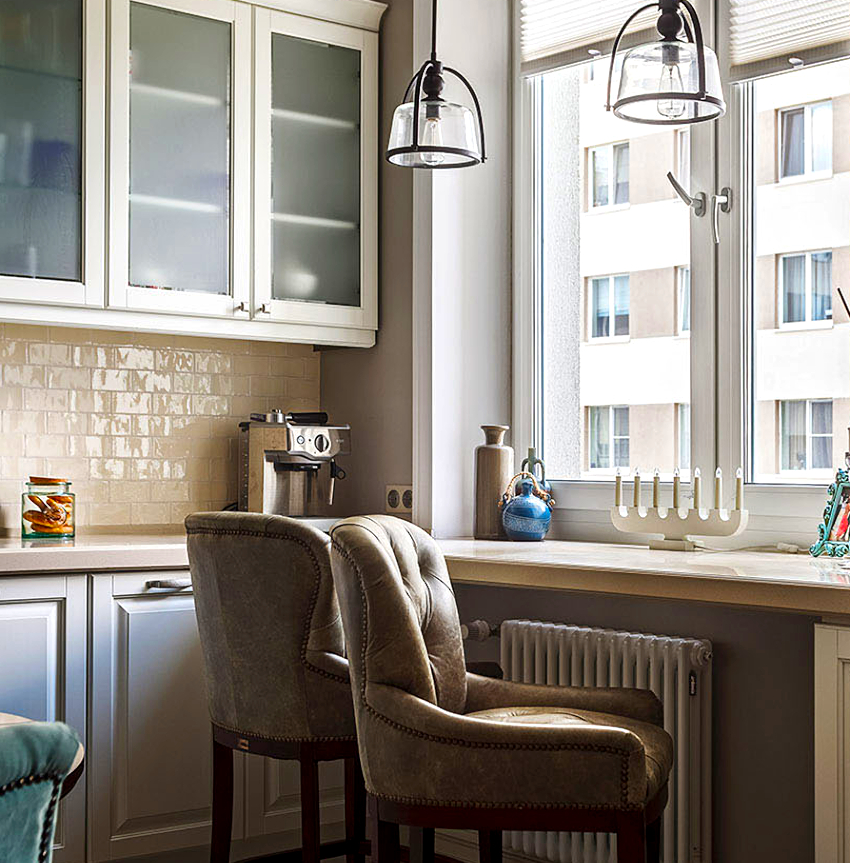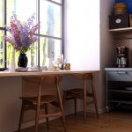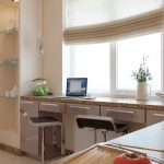 The blank countertop positioning method is convenient for small families of several people and provides the opportunity to save space as much as possible. The island-style table top that goes into the window sill allows chairs to be placed on two sides, making it possible to accommodate many guests.