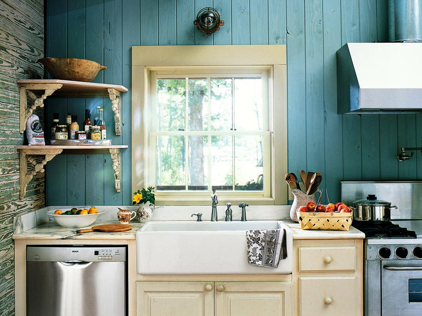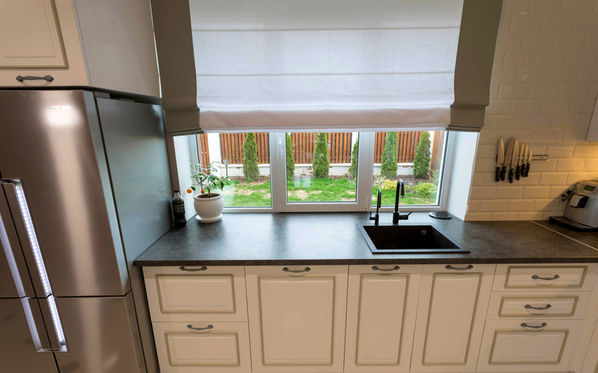 - Since a cabinet for storing dishes cannot be located above the sink near the window, it is better to place it under the sink or to the side of it. For a similar reason, a sink should be chosen with a special dish-drying dish.