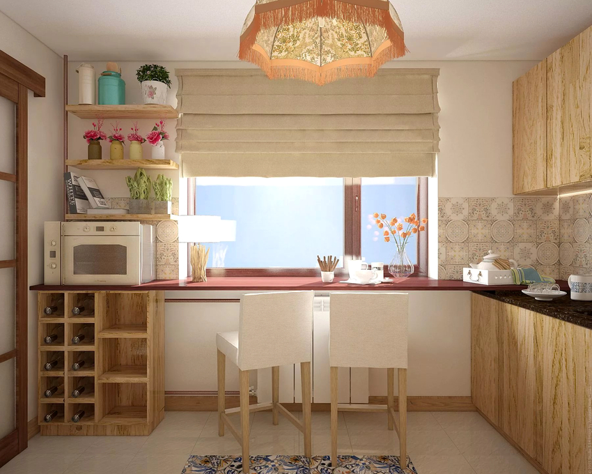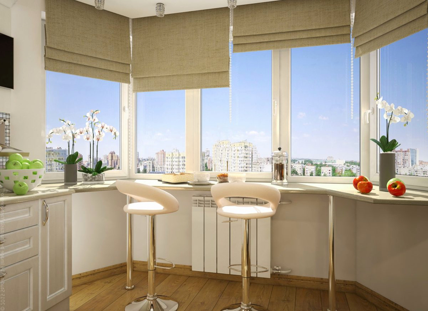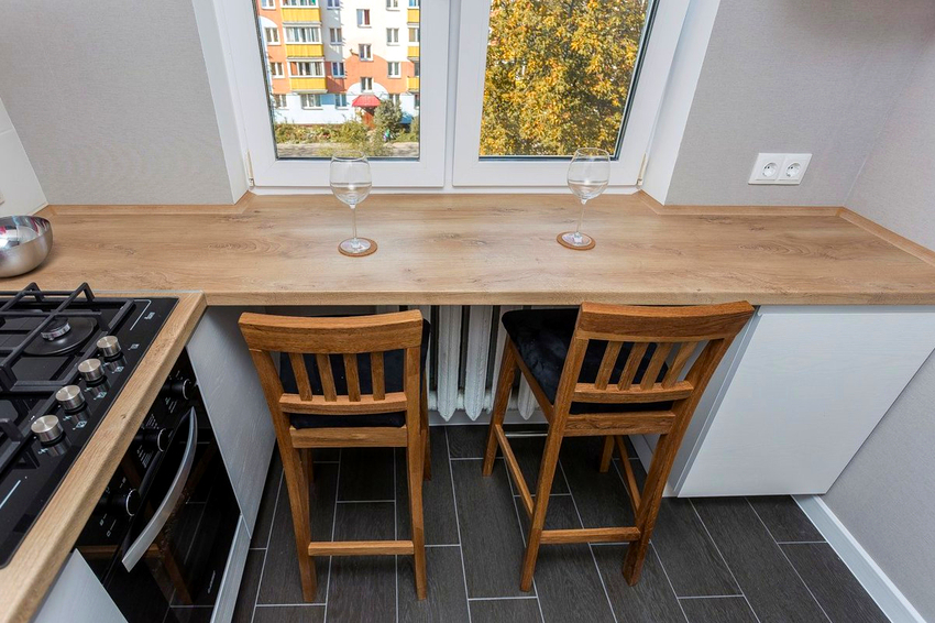However, in the event that the edge of the window is lowered below the standard 115 cm, this is also not a problem. The bar counter can be fixed at the "desired" height, and the window sill itself can be dismantled or turned into an additional shelf. In small kitchens where there is not enough room for a full table for eating, this will solve many problems. But such a relaxation area will not interfere with spacious rooms, especially if you can admire a beautiful view from the window.