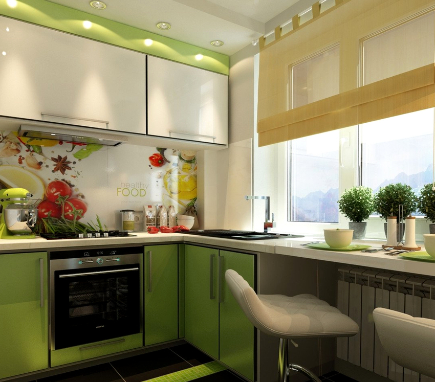 From a technical point of view, the simplest option is to build a kitchen line on top of the window sill, while leaving up to two tens of centimeters so that you can open the window sash and ventilate the room. The "groove" between furniture and glass can be closed with plant pots. It is not the most ergonomic solution, but the most economical one. There will be no need to replace the glass unit and go for tricks during the installation of furniture.