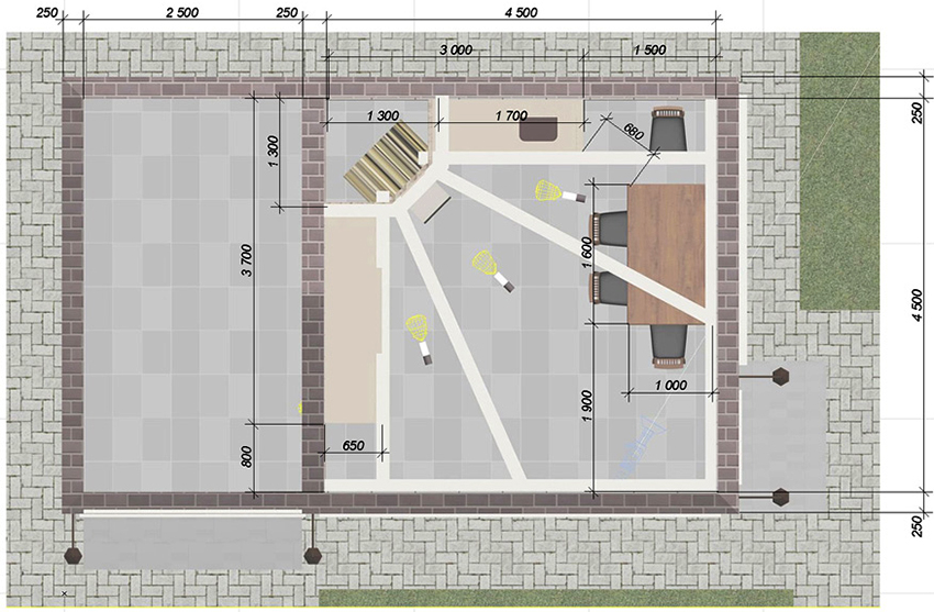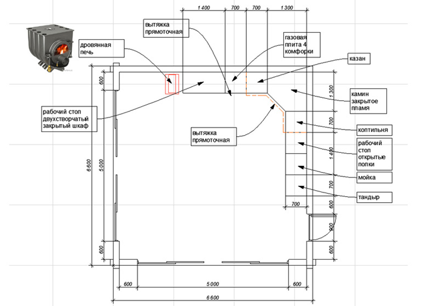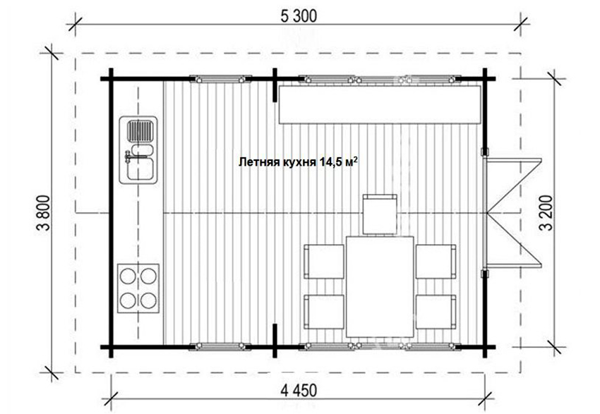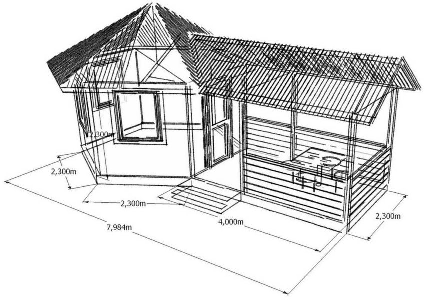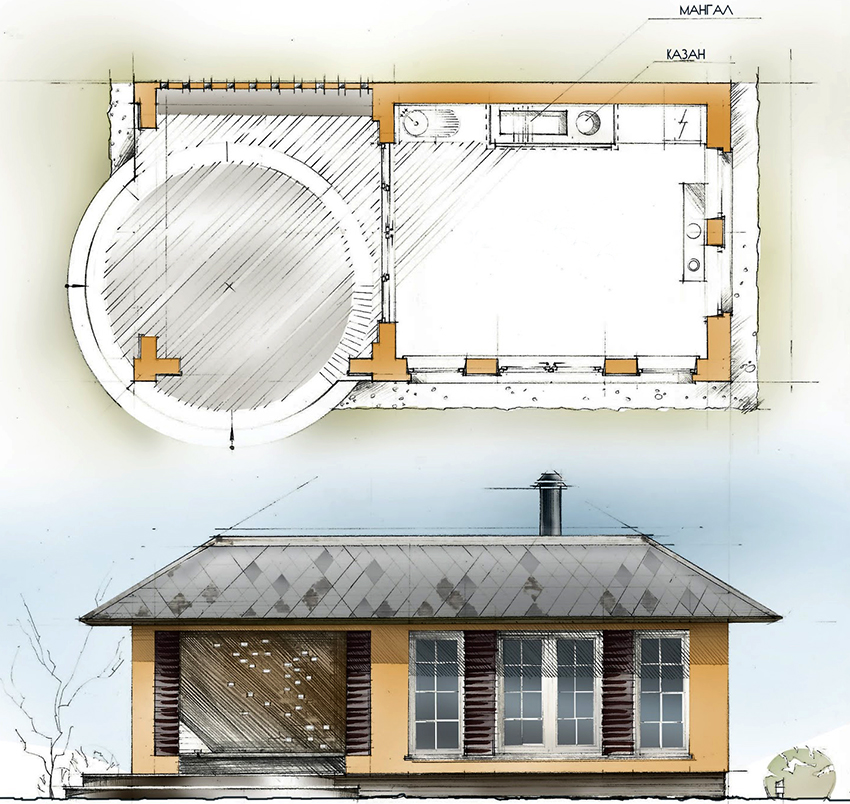 The construction plan depends on the purpose of the future premises, so you need to decide in advance how it will be used, whether you need to cook in the kitchen during the cold season. The size is determined depending on whether you plan to just cook in the kitchen or you need to install a dining group here.