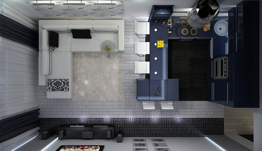 How to zone rooms: photo of the interiors of the kitchen-living room 20 sq. m