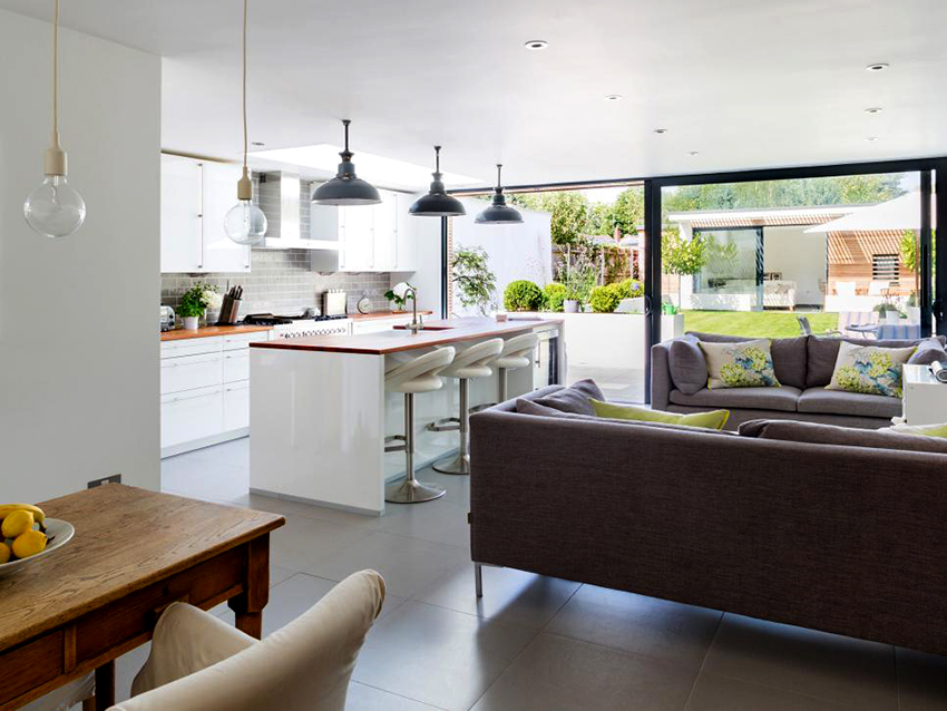 To avoid these problems, many designers advise to go for the trick and not demolish the entire wall that divides the spaces. The best option is to demolish part of the wall, where sliding doors are then installed. This step will avoid some documentary problems, and will also make it possible to make the kitchen a completely isolated room. On the Internet, you can see a good selection of photos of kitchens and living rooms together.