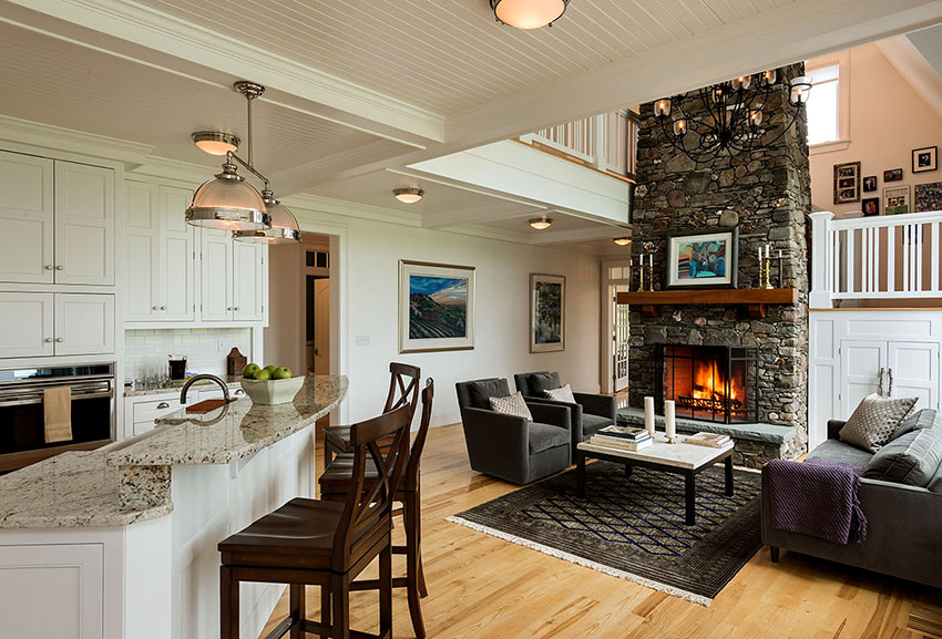 Useful advice! If you look at the photos of the interiors of the kitchen-living room in a private house, then you can pay attention that a beautiful fireplace installed in the living room area is an indispensable attribute of the premises. It will help create a cozy atmosphere in the room.
