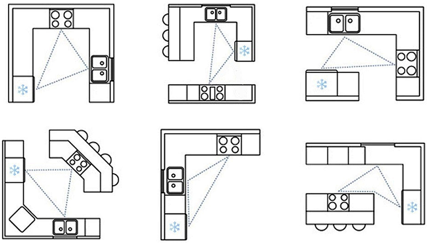 Whichever kitchen layout option is chosen, the main task is to organize a convenient and functional working triangle, at the tops of which a refrigerator, sink, stove or hob are placed. Be sure to leave a little work surface between the main items so that there is space for laying out food. It is not recommended that the longest side of the triangle exceed 2.5 meters, otherwise the time allotted for cooking will be wasted.