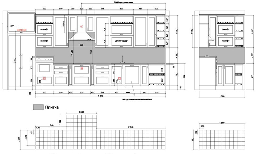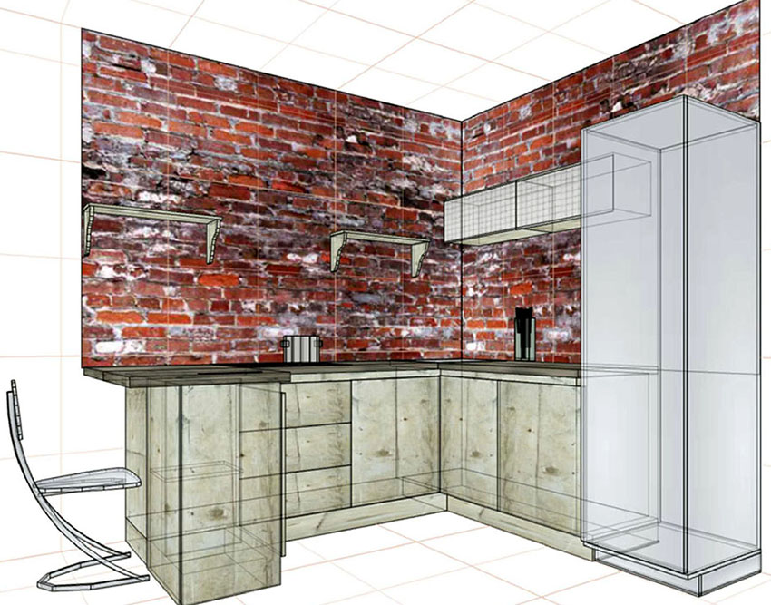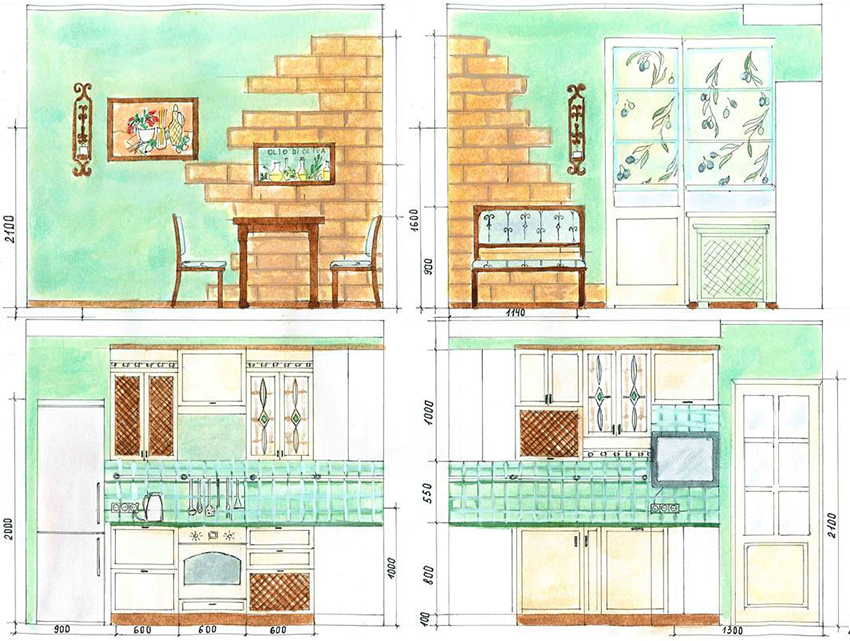 To make the kitchen project in a house or apartment the most informative, in the second sketch it is recommended to show the unfolding of the walls to visualize the side view of the kitchen. A side scan of the walls is needed in order to depict the surfaces of the walls on a scale, on which it will then be convenient to draw a drawing of the kitchen set and apply the location of the dining group. The unfolding is considered the most convenient tool, using which, it is easy to indicate the placement and positioning of shelves, kitchen cabinets and cabinets, as well as the location of household and lighting fixtures.