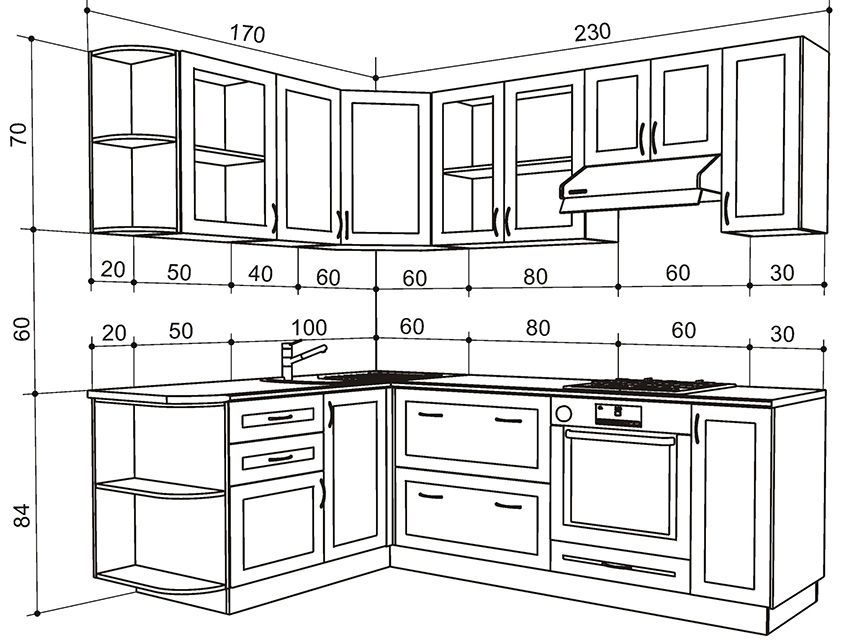 Before making a kitchen design and creating a project, you need to carefully perform a detailed measurement of the kitchen area. You need to understand that this action is carried out after repair for finishing, since if the transfer and alignment of the walls is required, this will significantly change the configuration of the space and affect other parameters.