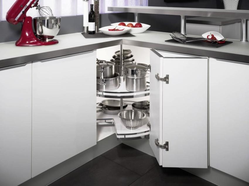 Due to the special spaciousness of the corner cabinets, it is possible to install complex structures and all kinds of devices, for example, carousel and pull-out shelves.