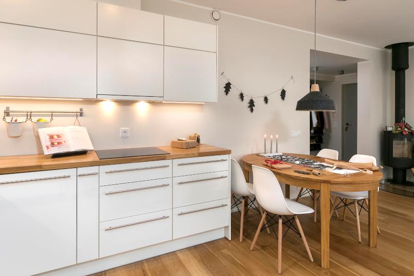 Helpful advice! You should not buy cabinets with a countertop less than 60 cm, as there may be problems with built-in appliances. The only exception is the design of a small kitchen.Too wide countertops are appropriate only in spacious rooms, but a kitchen with a depth of more than 90 cm will be simply inconvenient to use, since it is difficult to get deep into the cabinet.