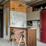 Another of the modern and fashionable materials for wall decoration is decorative stone. It is often used to create loft-style interiors. One accent wall can be faced with decorative stone. This material goes well with other finishing elements. It can be safely combined with decorative plaster and wallpaper, as clearly shown in the photo of repairing a small kitchen in Khrushchev.