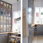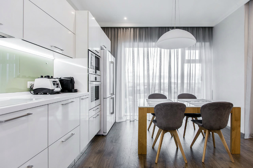 A practically weightless element in the kitchen interior is the use of transparent glass objects. It can be a round or oval dining table, transparent plastic chairs, hanging glass shelves.