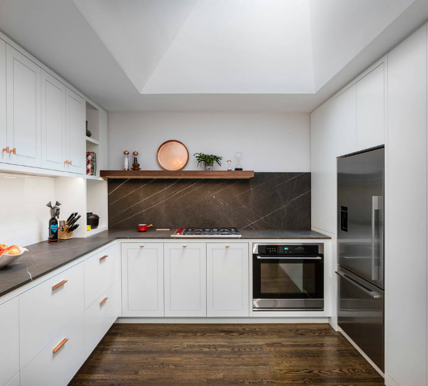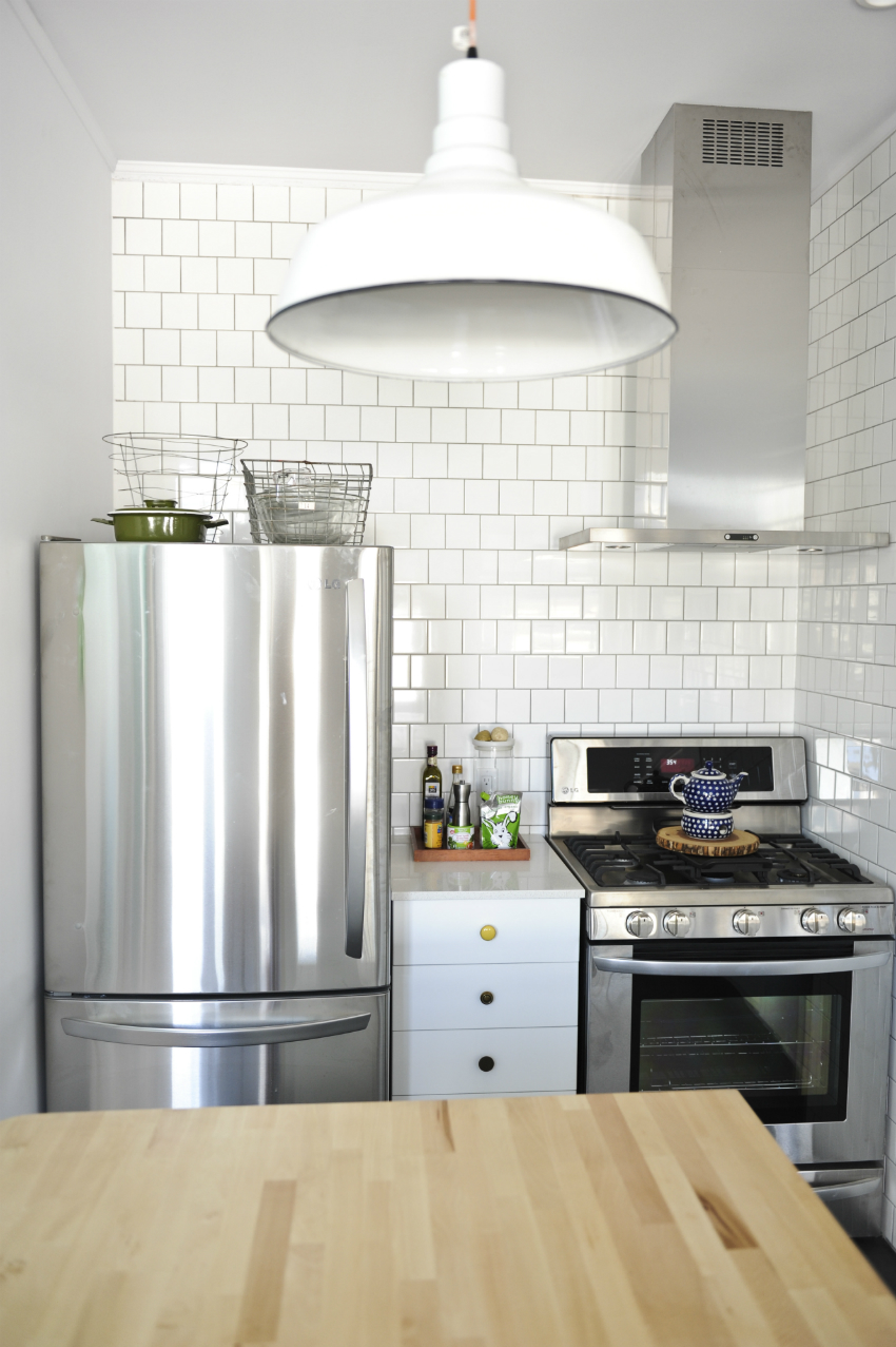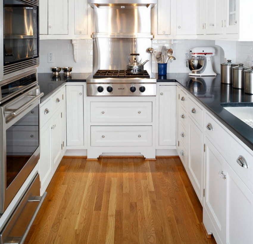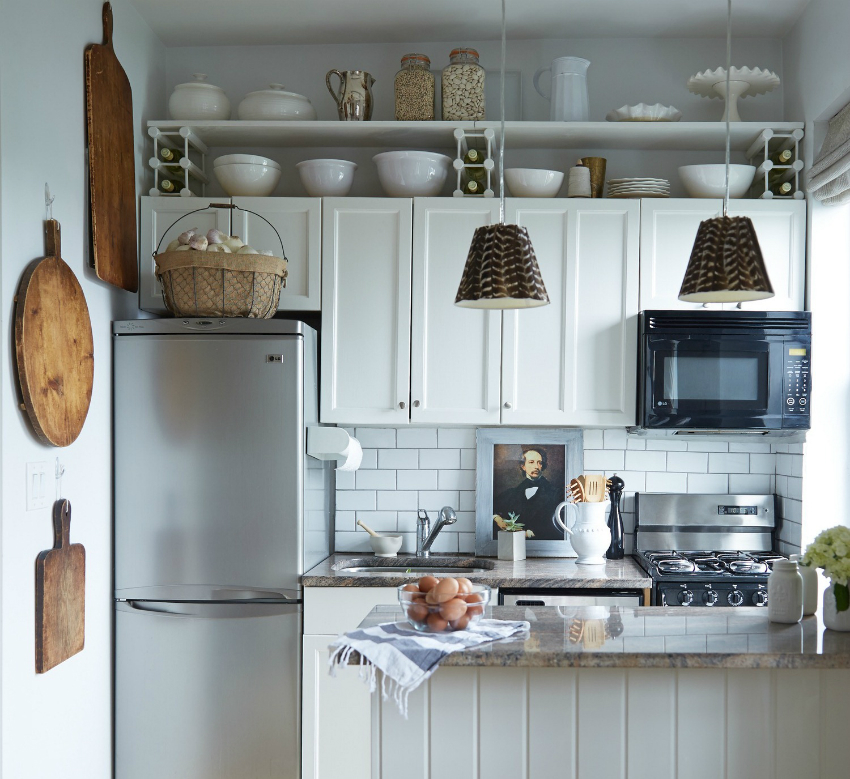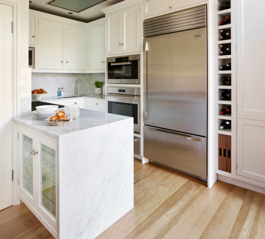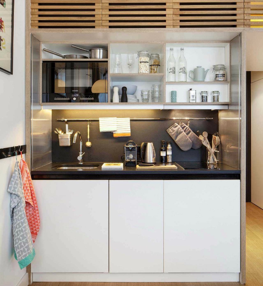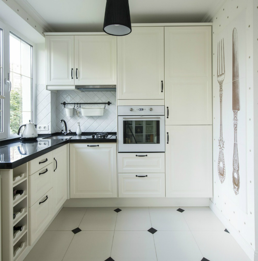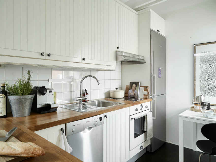 To save space in a small kitchen, you should use appliances that can be built directly into the kitchen set