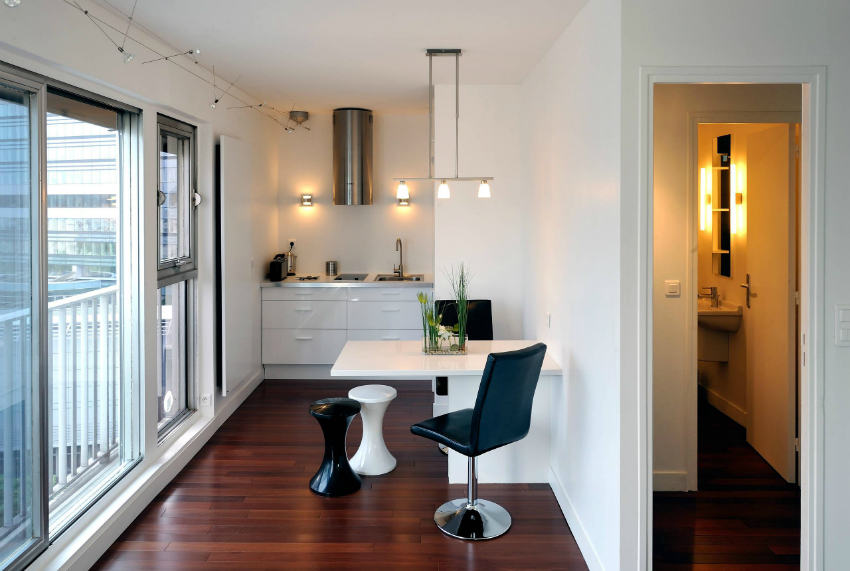 Another interesting solution is the use of a bus lighting system. Its peculiarity is that the lamps can be grouped and moved, adjusting the direction of the luminous flux. This is convenient when the dining table can be moved around.