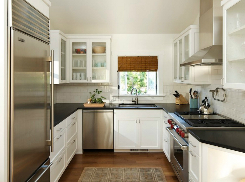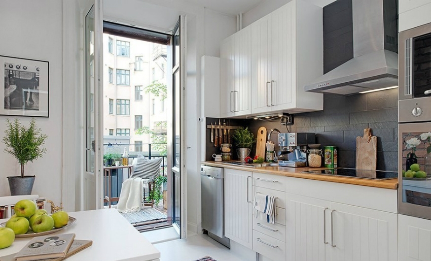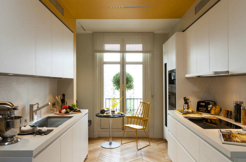 A good way to save space is to combine the hob, sink and work area with one worktop. For this purpose, you can use the place on the windowsill, where you can also create a work surface. A great idea of visually increasing the space is to place the refrigerator in the corner farthest from the entrance.