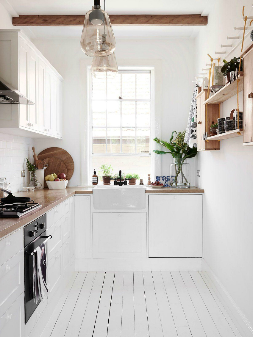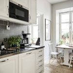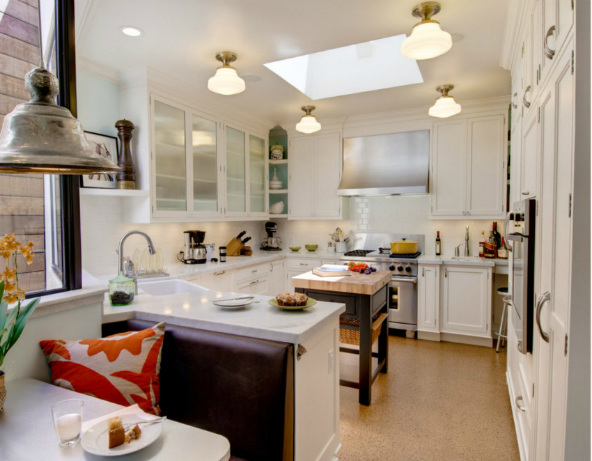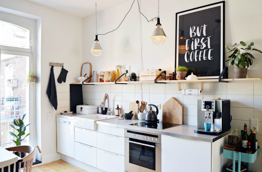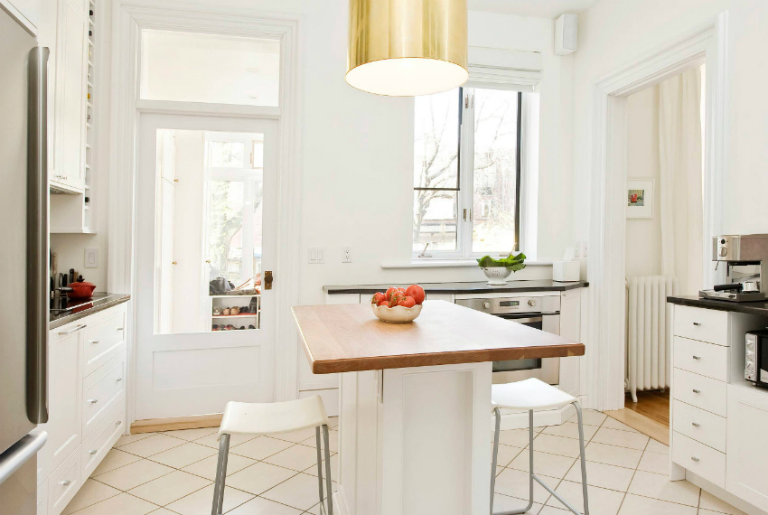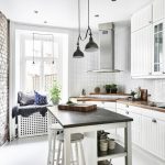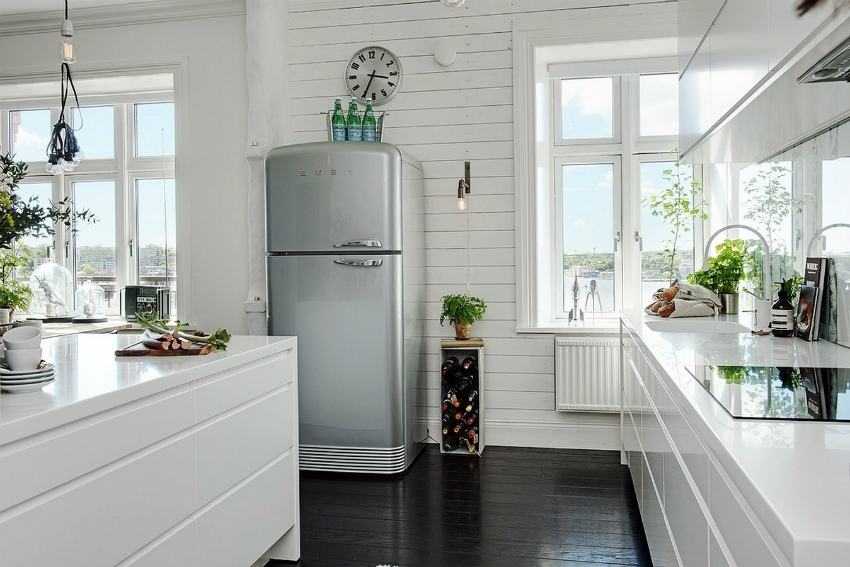 Thanks to white kitchen, which reflects and diffuses light, you can not install many additional lighting items