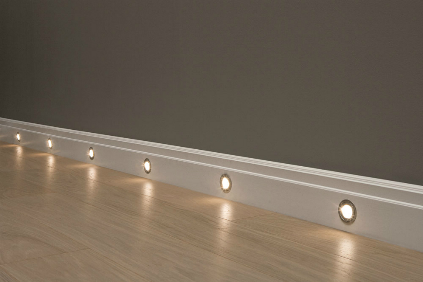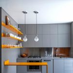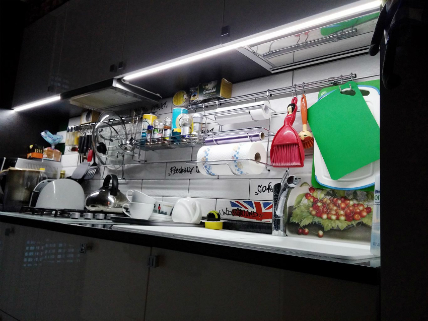 Illumination of the working area can be created using led strip in aluminum or plastic profile. Such lighting will not only have an attractive and aesthetic appearance, but will also create a spectacular illumination of the countertops and kitchen cabinets. Another interesting option is LED lightswhich is integrated into the glass apron of the kitchen or placed on open shelvesmade of tempered glass. A mobile solution is the use of pegged lamps that can be carried to the desired location.