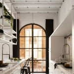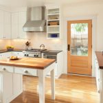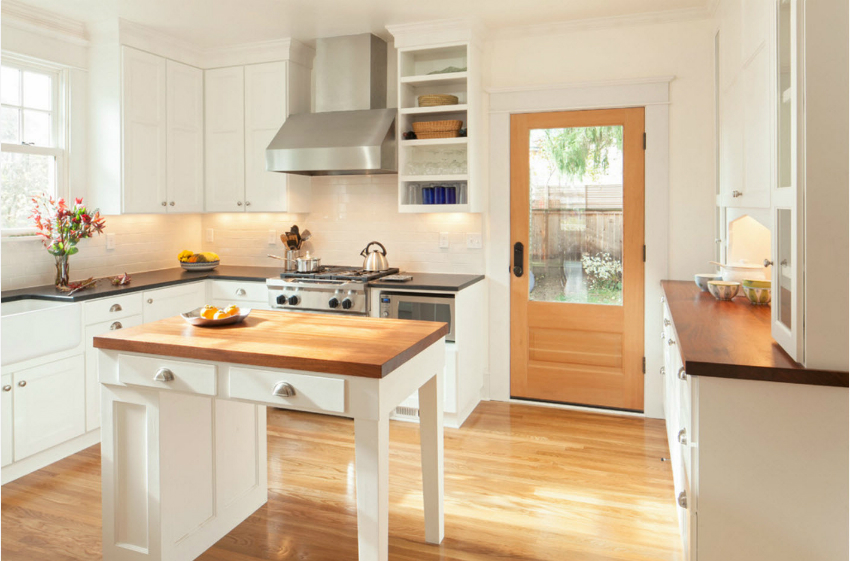 Depending on the chosen design of the room, the exit from the kitchen can be equipped with a door or an arch. The doors can also be installed in plastic or wood. Plastic doors are moisture resistant, sealed, do not deform or dry out during operation. They provide high heat and sound insulation of the room. Their price is significantly lower than their wooden counterparts. However, wood or products made from it are more environmentally friendly, and new technologies can improve their performance.