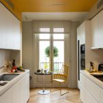 The main rule of small rooms is to decorate the walls and ceiling in light pastel colors, which will fill the kitchen with freshness and make it airy. Cream shades, light brown tones, cocoa, milk, pistachio ice cream and milk tea, universal white will cope with this task. This can be clearly seen in the photo of a real design of a small kitchen, which was renovated in a light palette of various colors. Furniture facades can be olive, light yellow, peach. The ideal would be to use smooth lacquered surfaces that reflect light well.