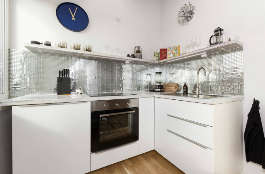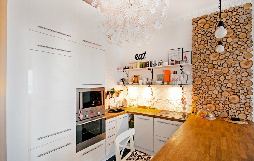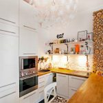 You can add additional depth and uniqueness to a small kitchen with the help of decorative elements: a mirror, a transparent and shiny vase with fruit, original paintings arranged vertically, unusual designer clocks. All this will give the room an additional note of warmth and comfort, and will certainly emphasize the good taste of the hostess.